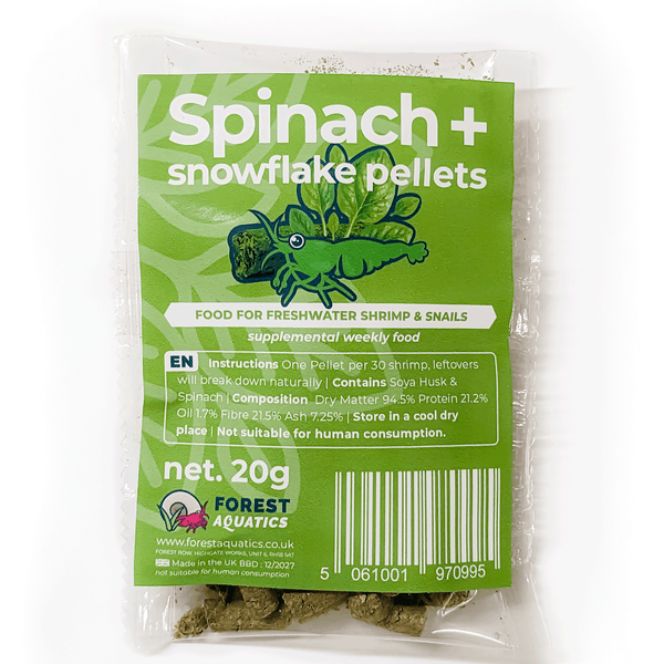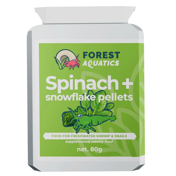 Support the health and natural behaviour of your freshwater shrimp and snails with Forest Aquatics Spinach & Snowflake Pellets. This plant-based blend combines nutrient-rich spinach with snowflake (soy husk), creating a slow-breaking, graze-friendly pellet ideal for Cherry Shrimp, Crystal Shrimp, Tiger Shrimp, Nerites, Ramshorns, and other freshwater snails.